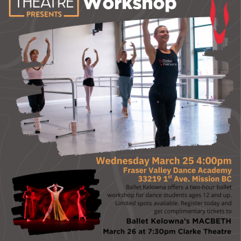 Ballet Kelowna will be at FVAD for a 2-hour workshop with repertoire from Macbeth on March 25 at 4pm for students ages 12+. Participants will receive free tickets to Macbeth