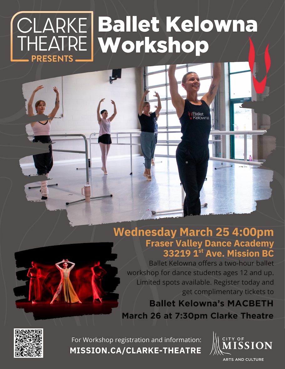 Ballet Kelowna will be at FVAD for a 2-hour workshop with repertoire from Macbeth on March 25 at 4pm for students ages 12+.  Participants will receive free tickets to Macbeth at the Clarke Theatre on March 26.